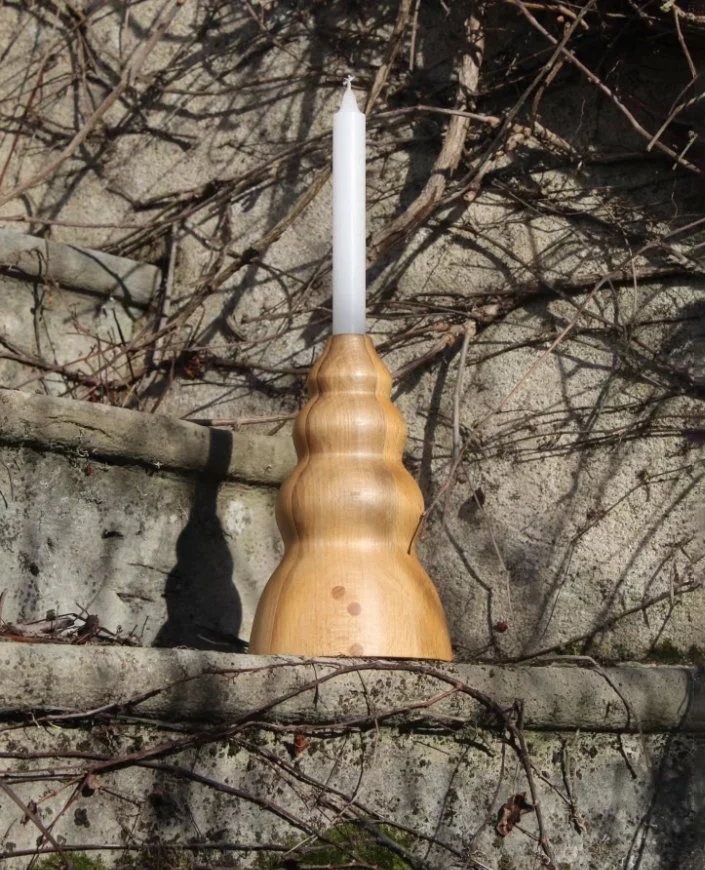 Une collection de bougeoirs réalisés à partir de bois de récupération.